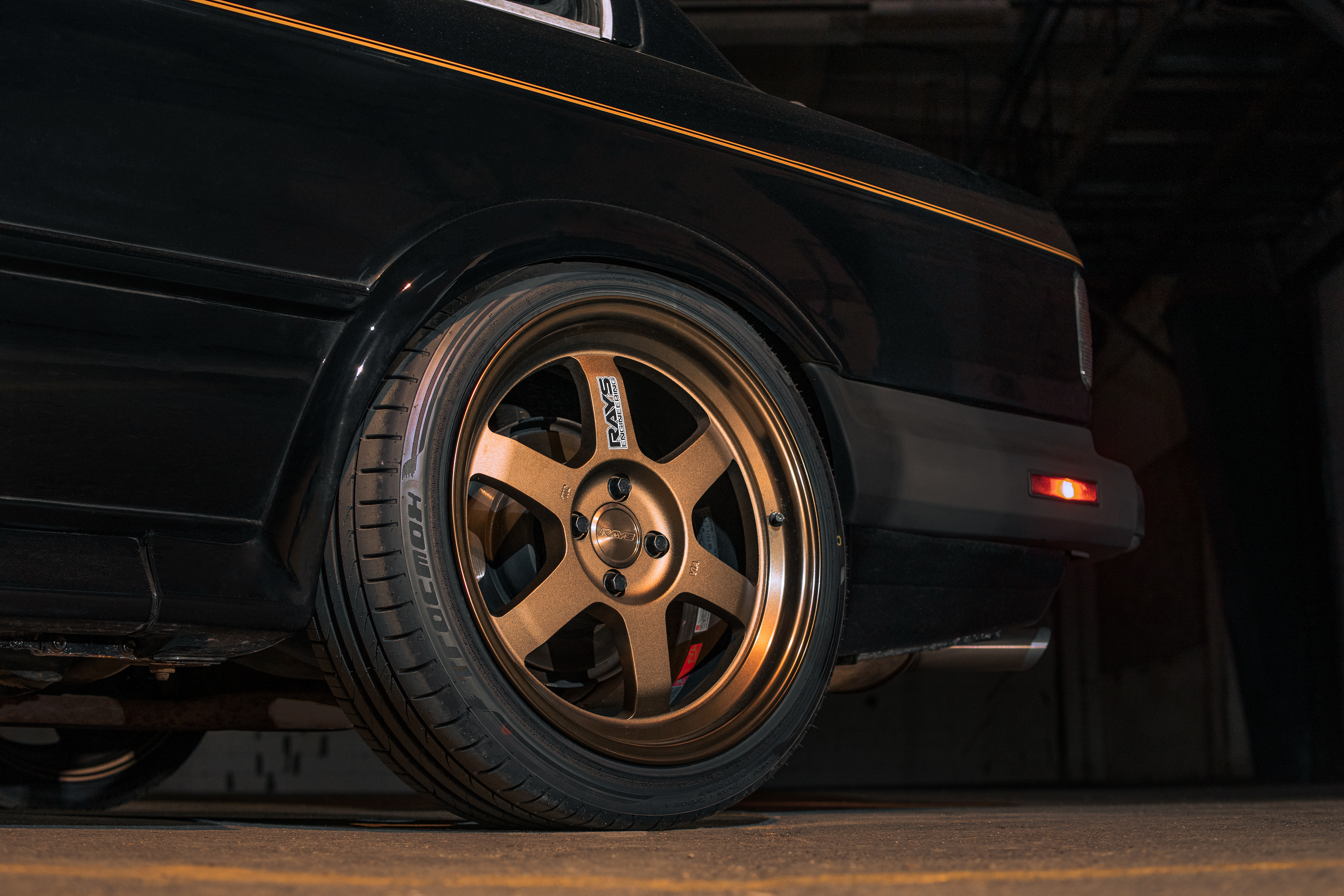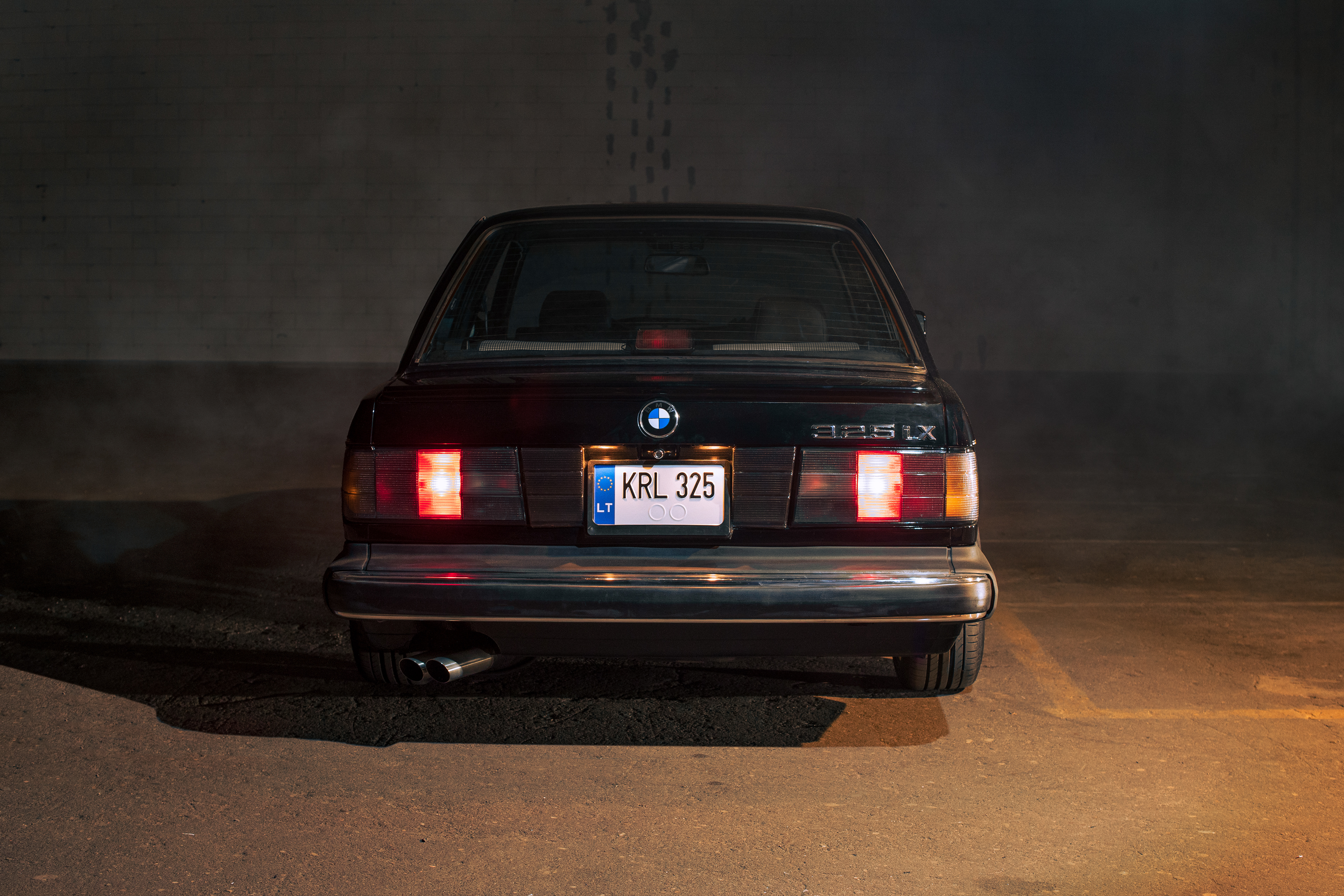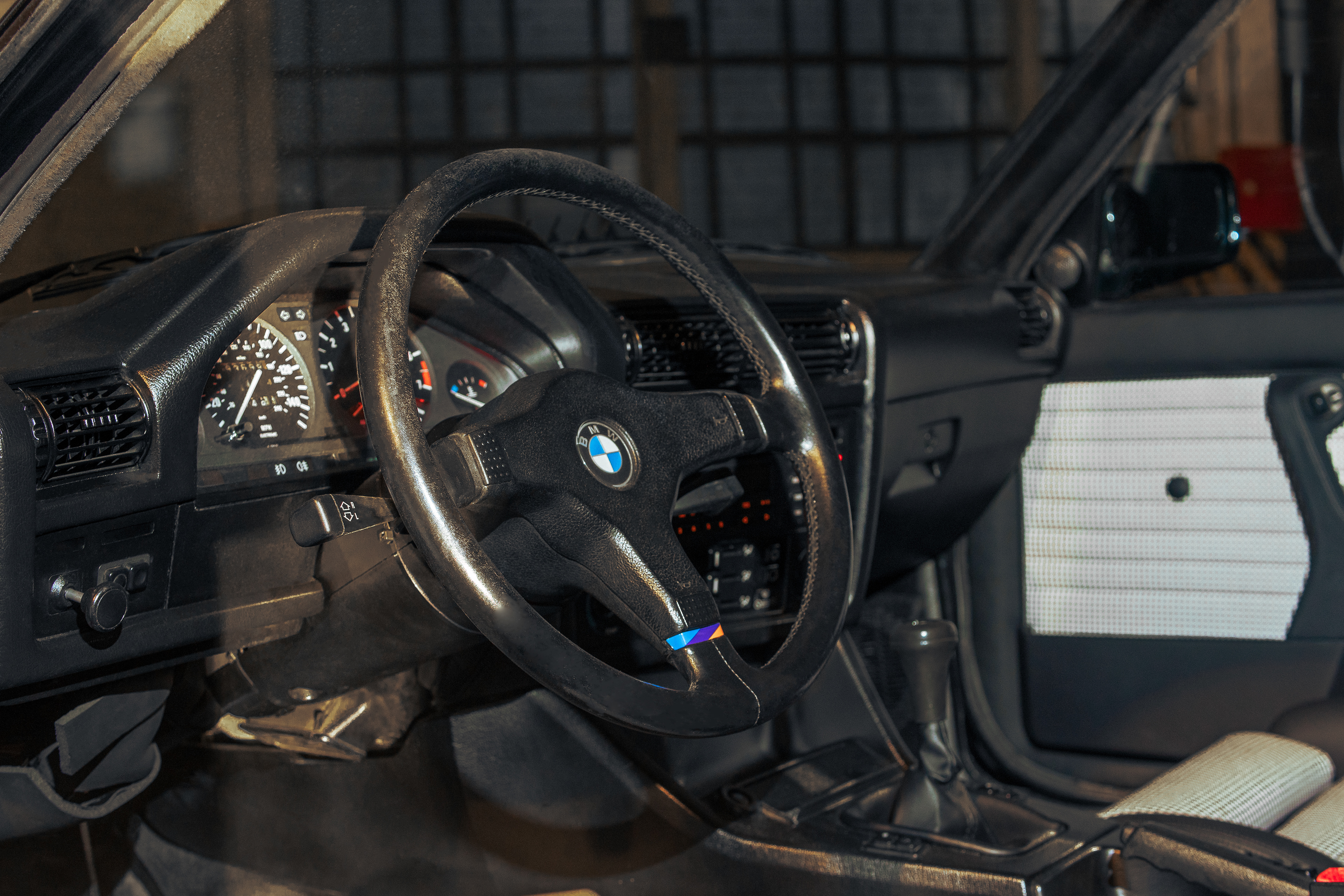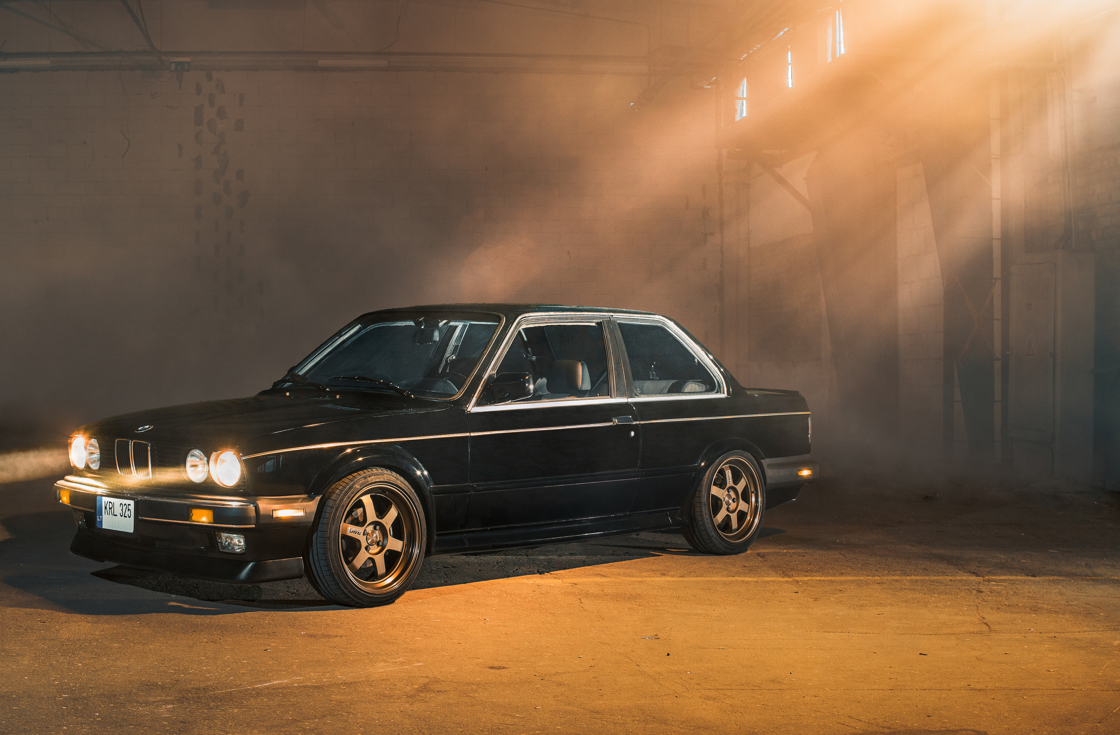Photoshoot for client's BMW E30 325ix photographed in a warehouse, using a smoke machine and a direct light beam from a window