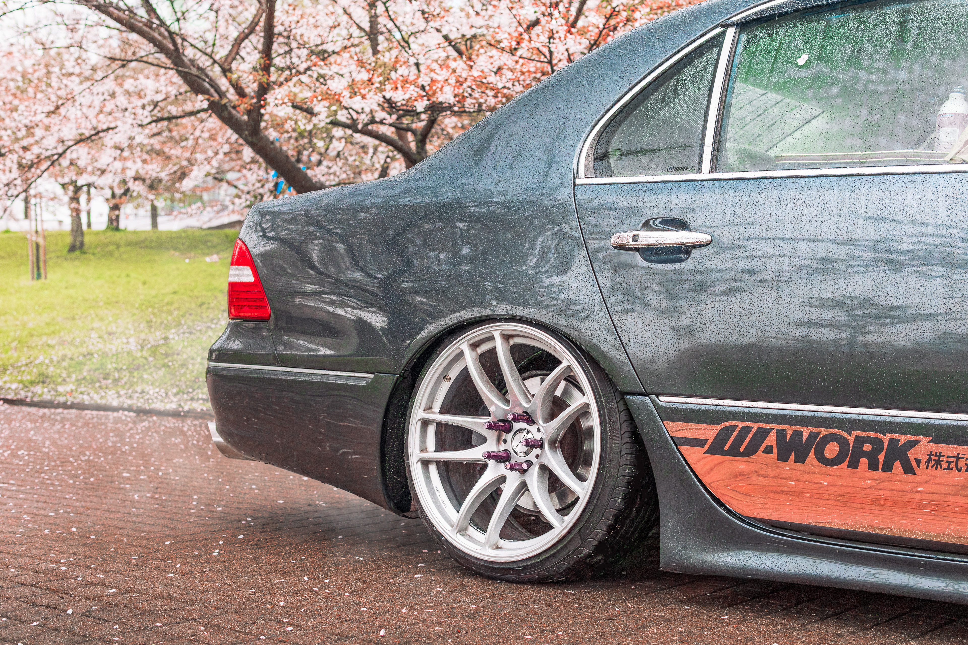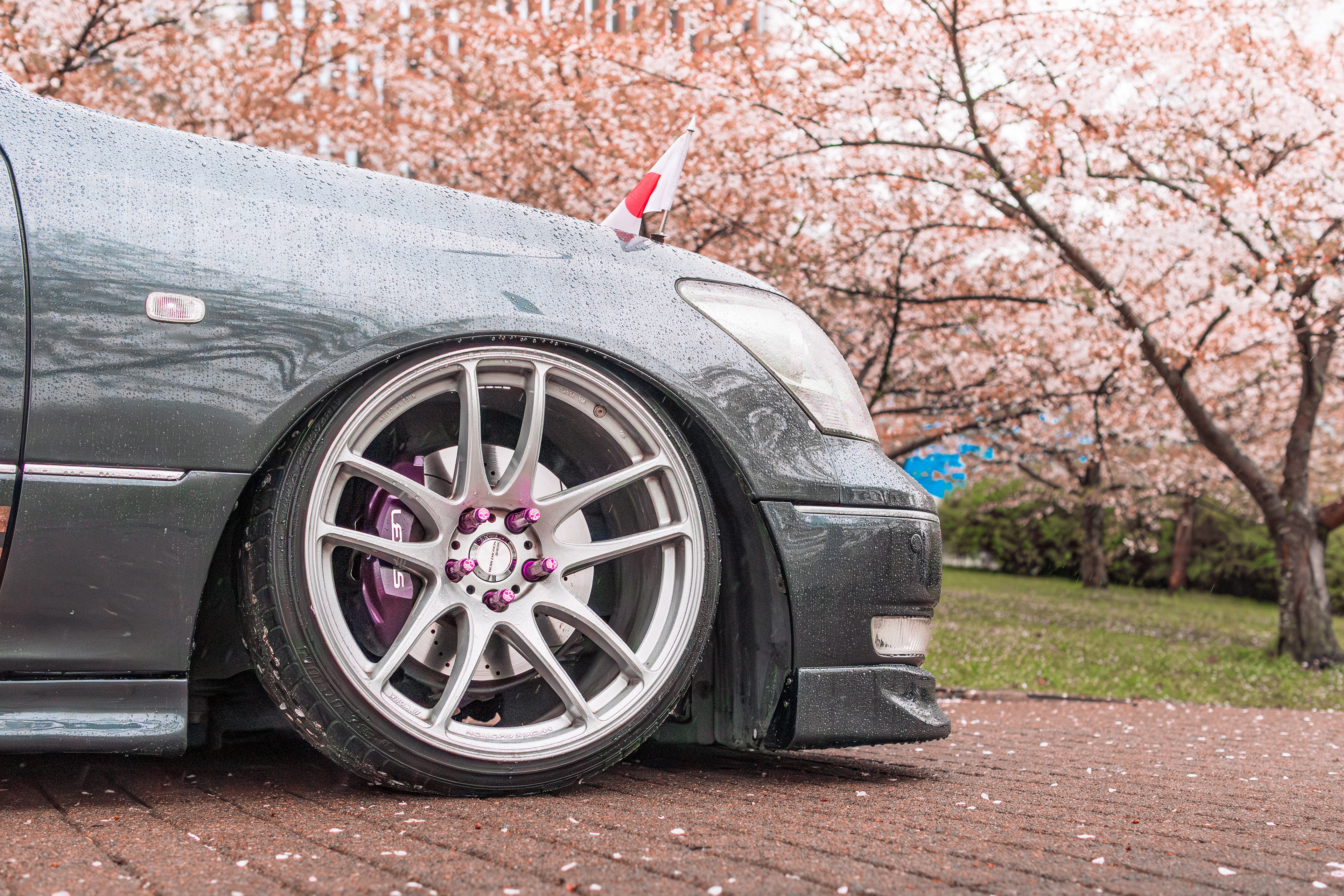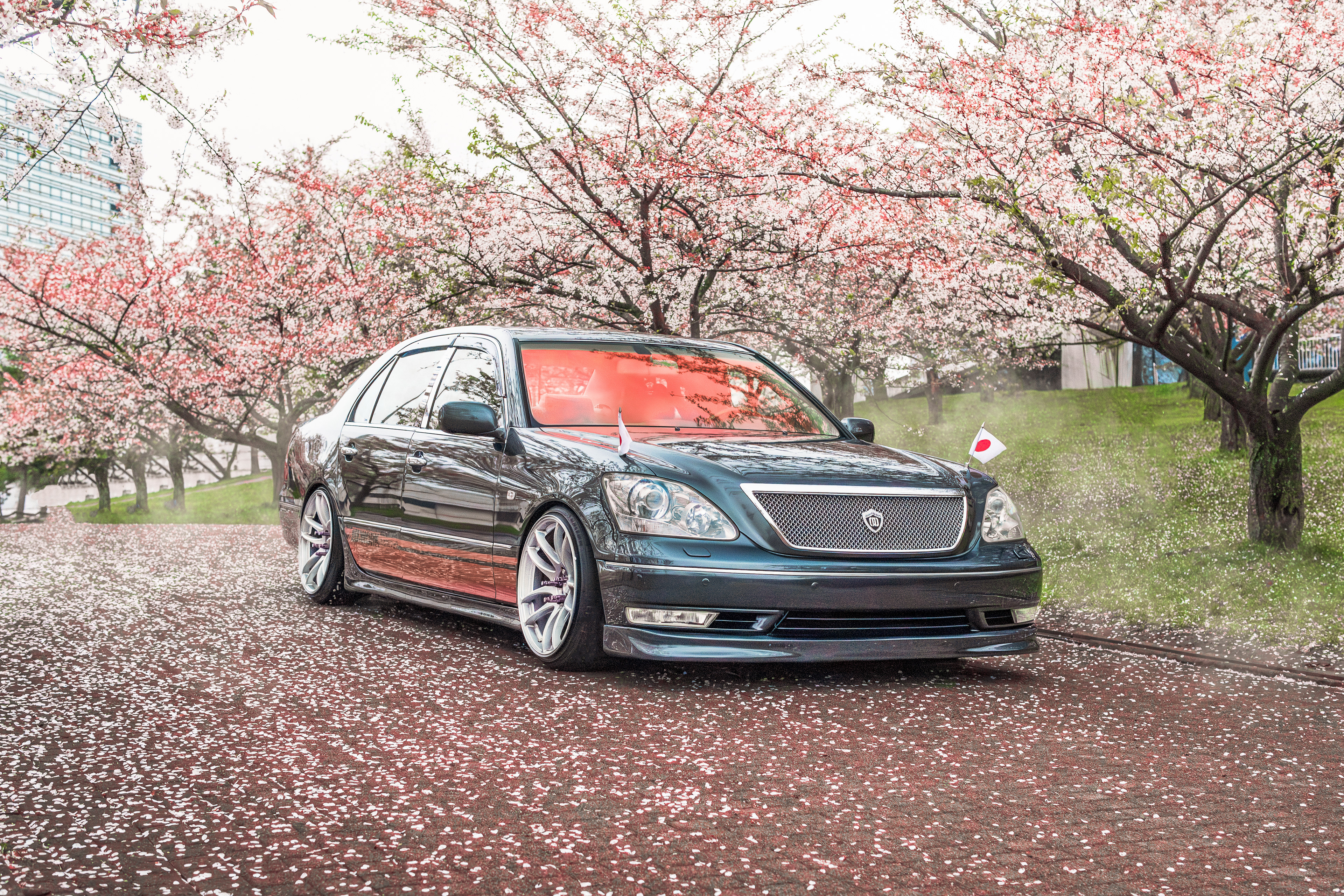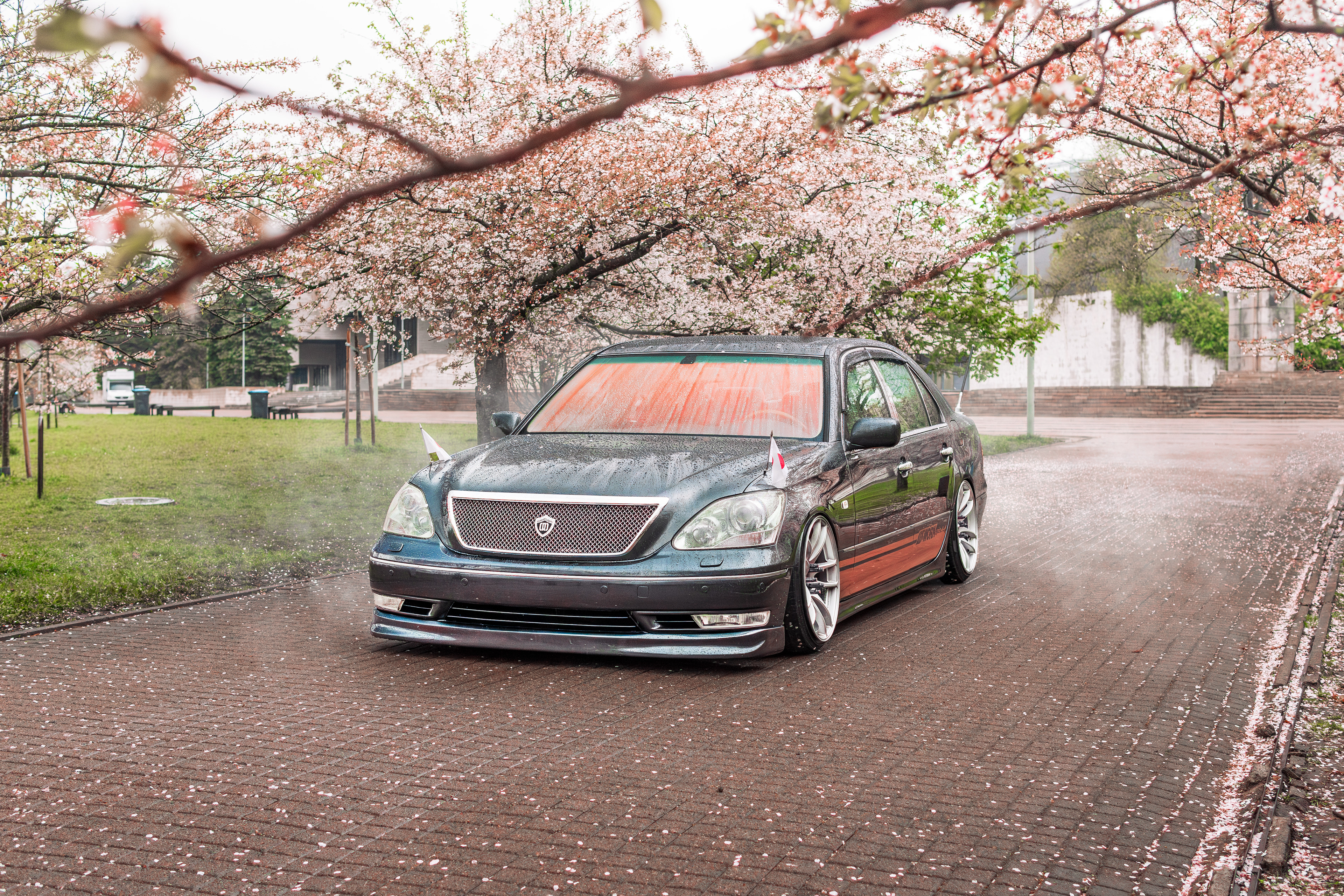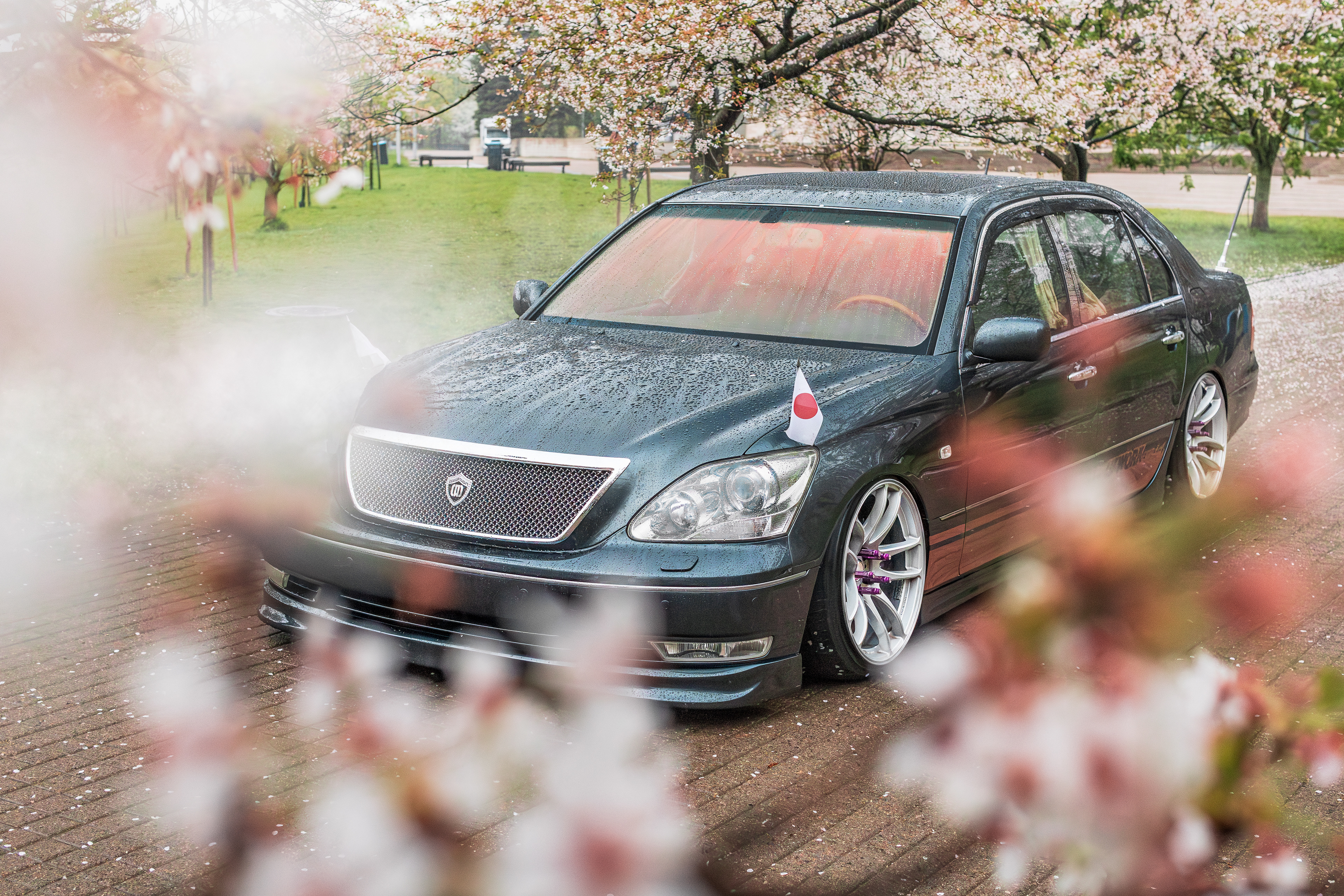 Bippu/VIP style Lexus LS430 photographed between blooming cherry blossoms