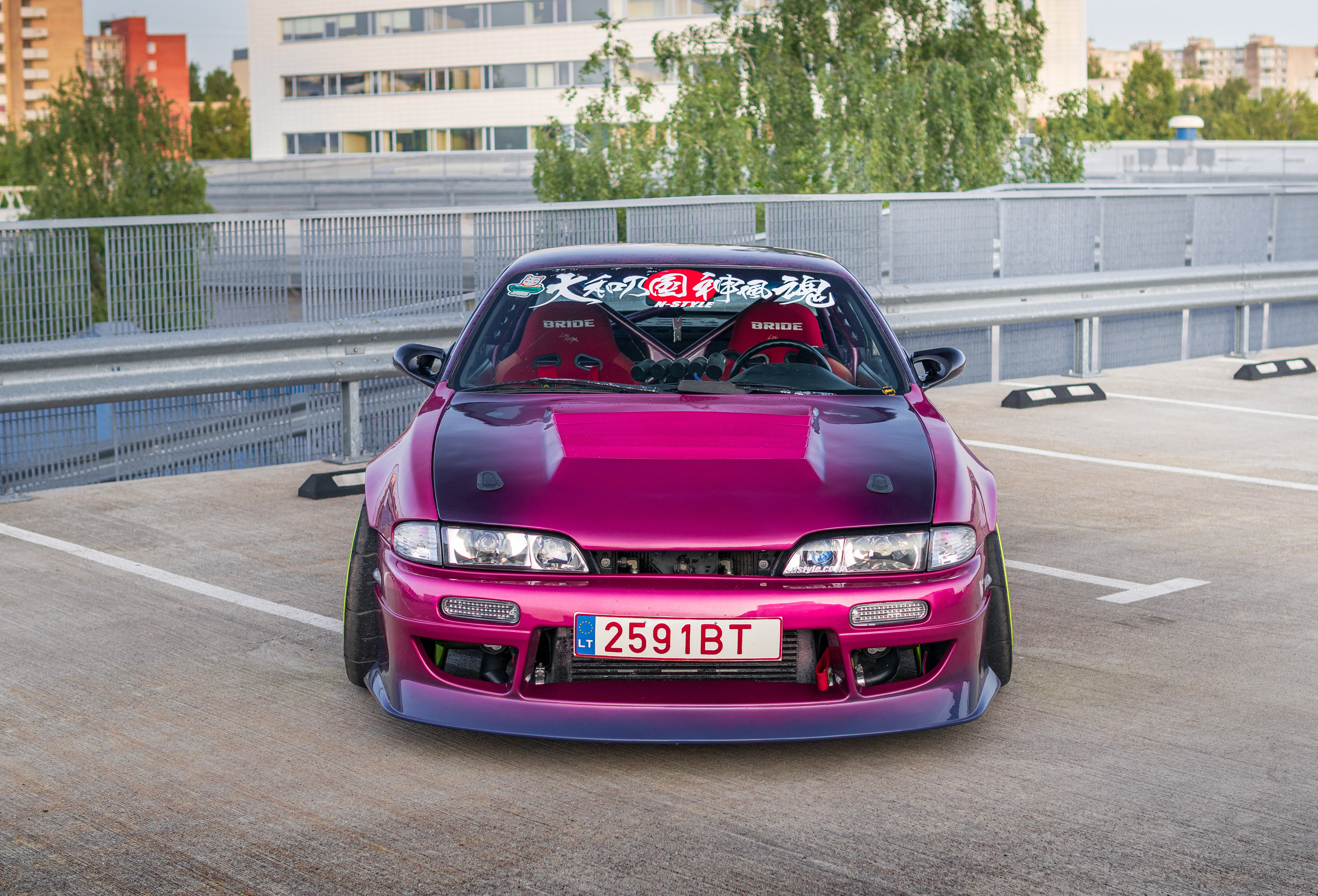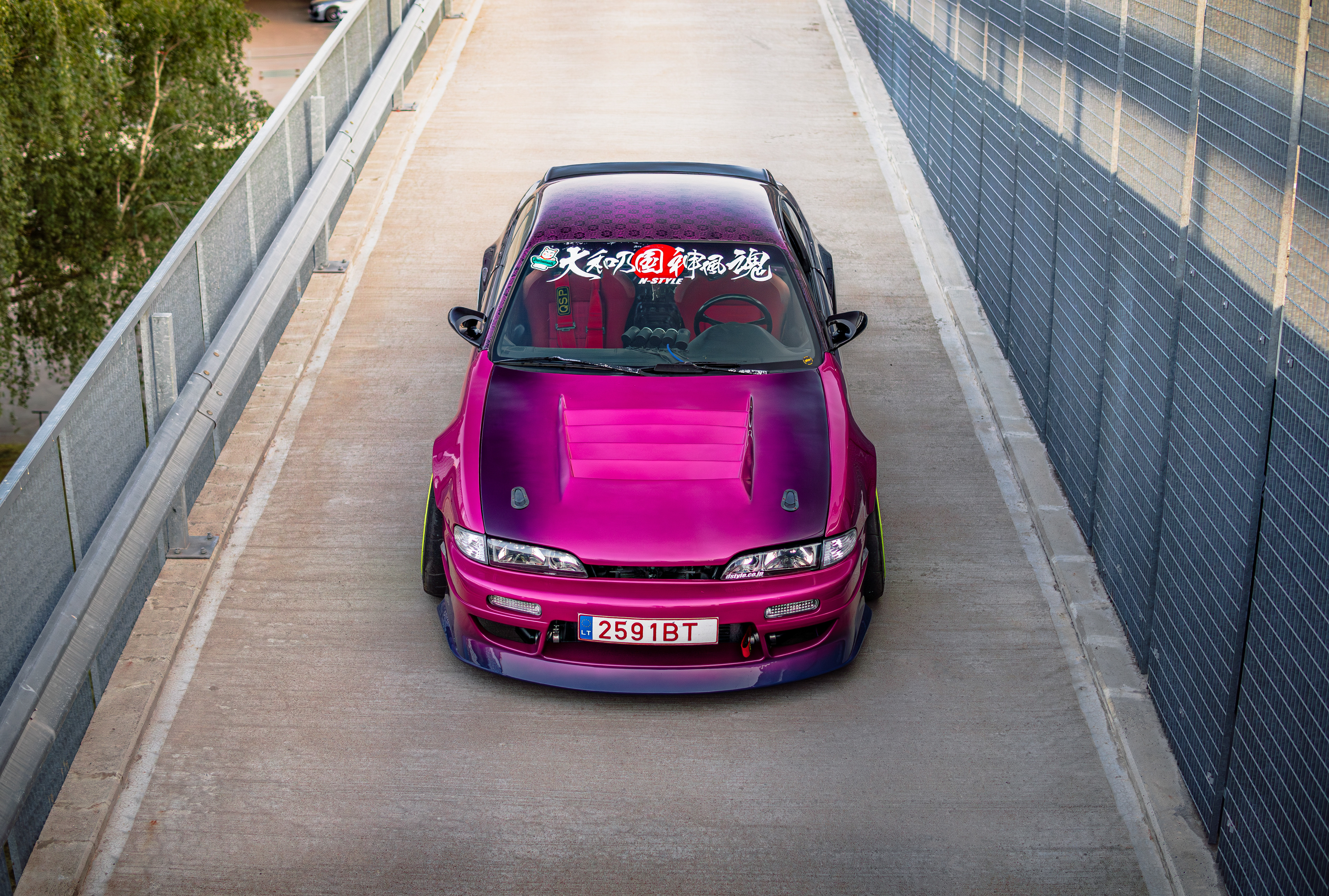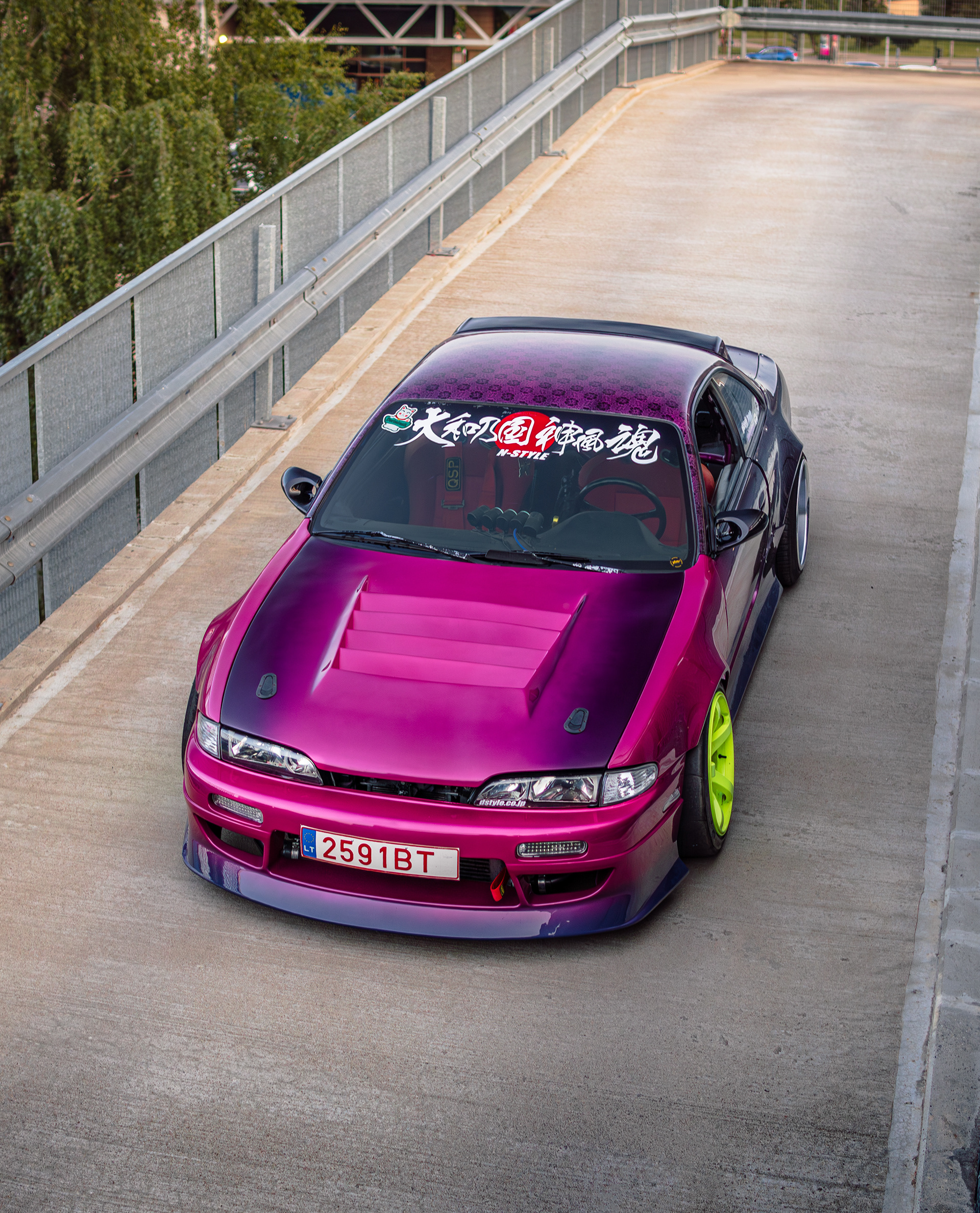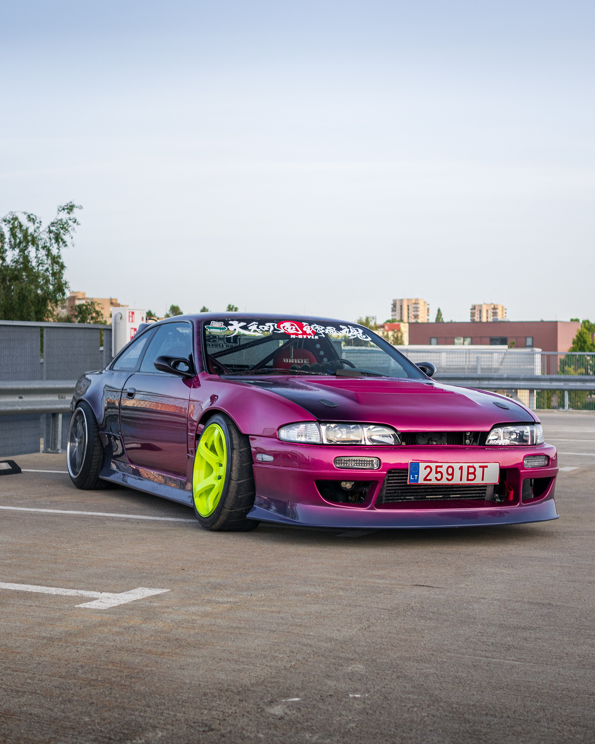 Rooftop photos of a triple-color Team Burst style Nissan S14 200SX